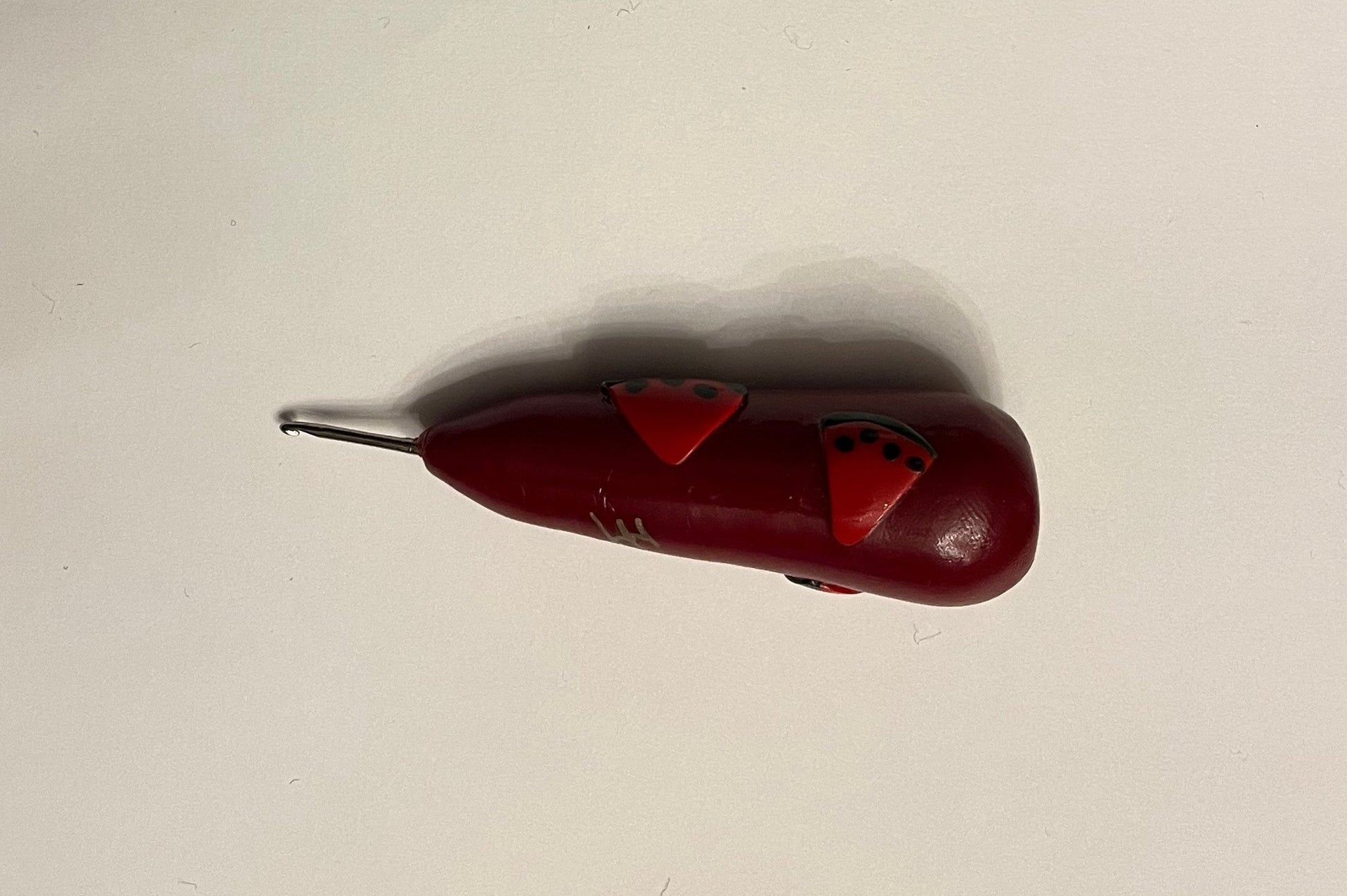 This is a hand painted maroon rug hook with a watermelon motif. The hook is approximately 3 3/4" long in total with the barrel measuring approximately 3/4" RMH1016